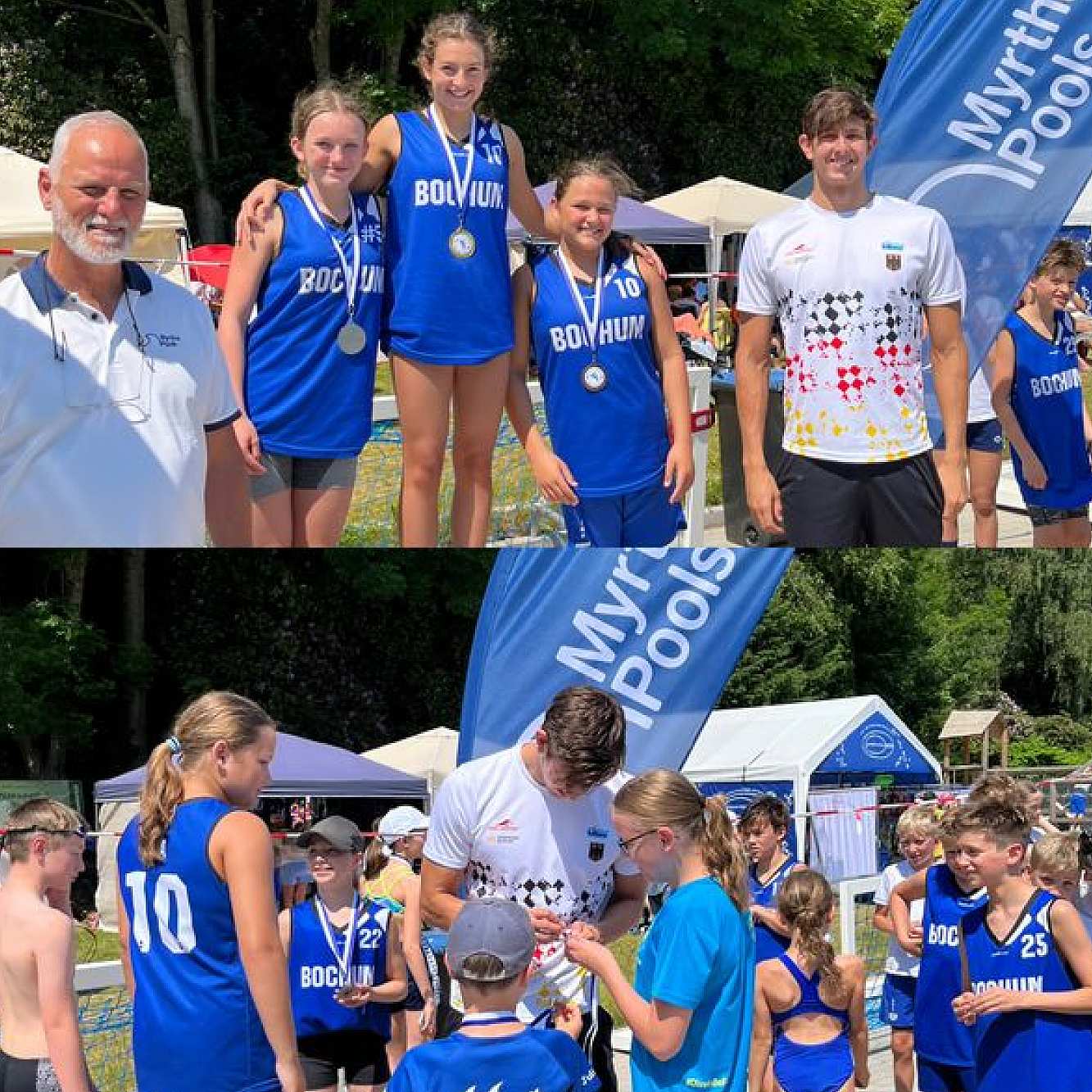 Und als besonderes Highlight war Olympiateilnehmer Lucas Matzerath zu Gast beim Wiesentalpokal. Er übernahm die Siegerehrungen für die 100m Brust und signierte im Anschluss zur großen Freude der Schwimmerinnen und Schwimmer T-Shirts, Medaillen und Badekappen.