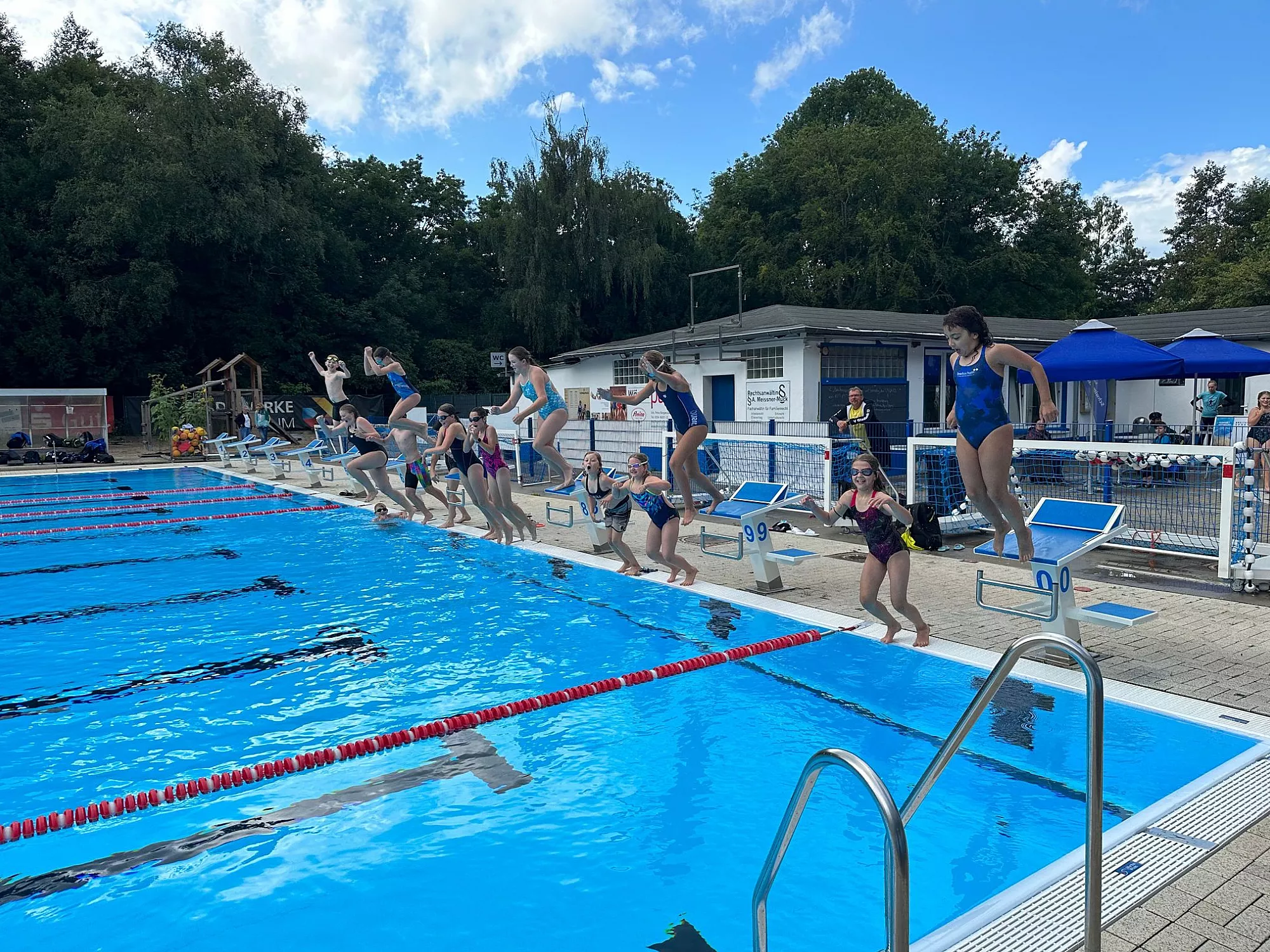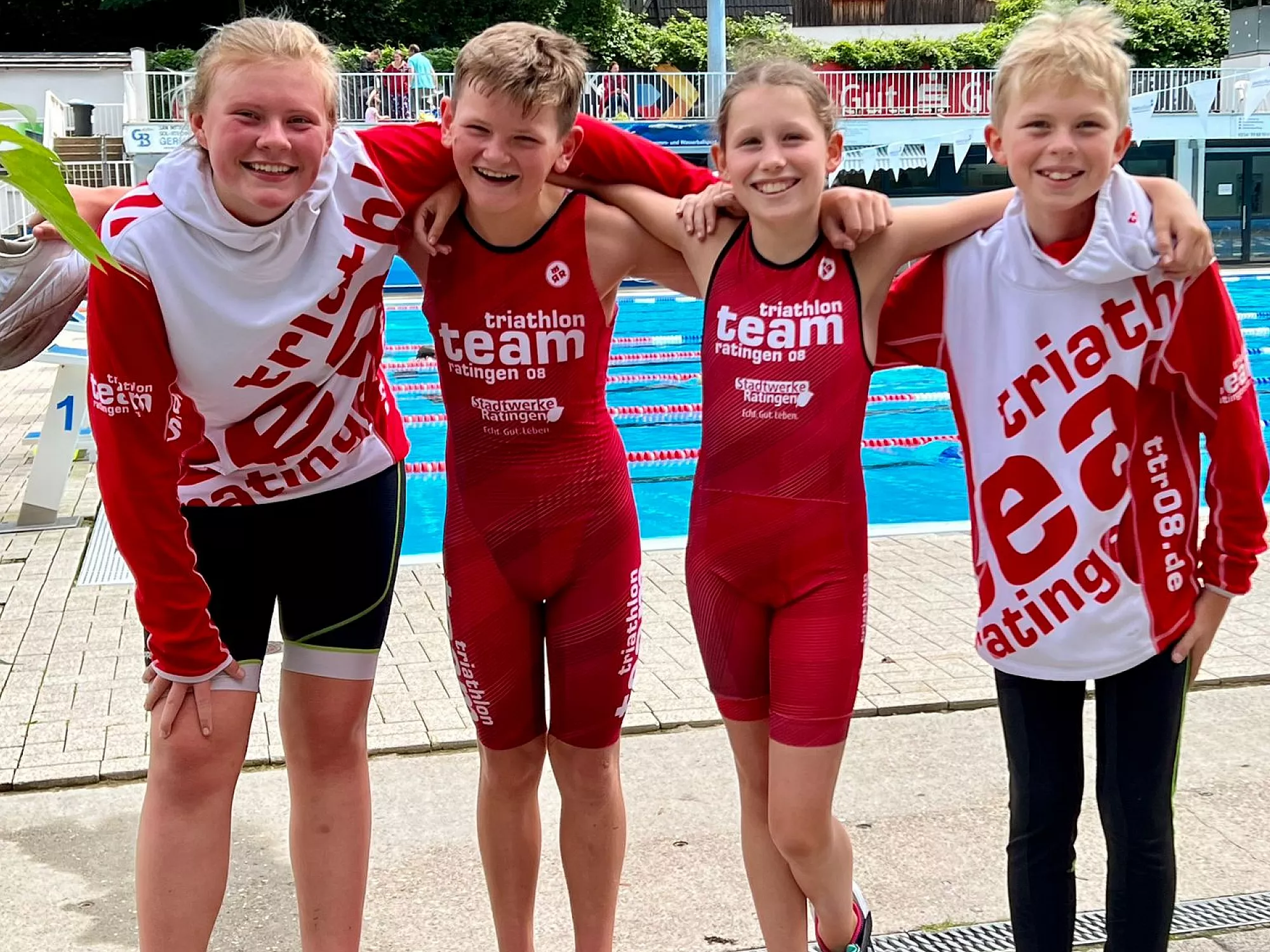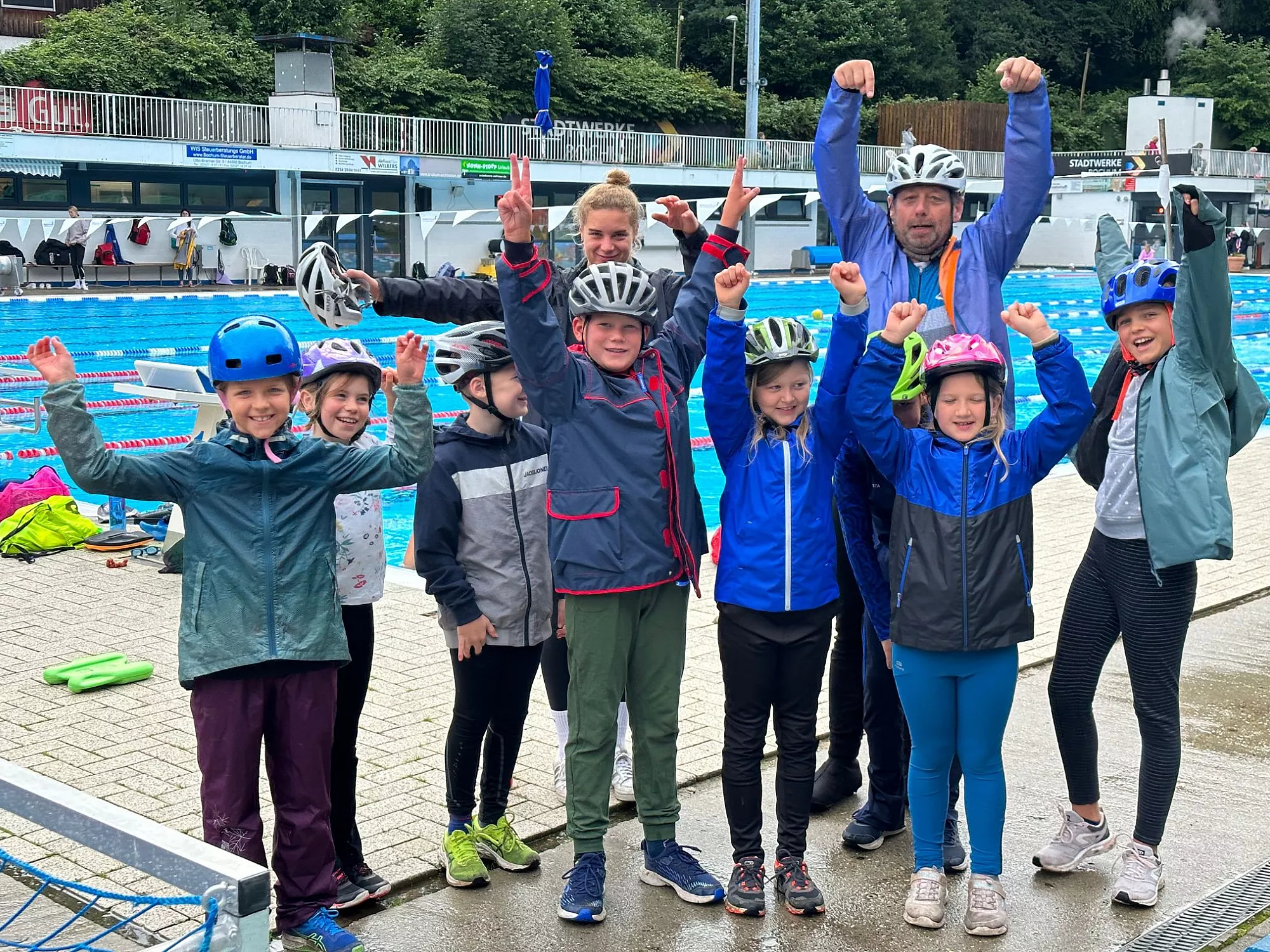 Am Freitag zeigte sich zum Abschluss dann endlich mal die Sonne. Passend, denn wie jedes Jahr mussten die Kids das Gelernte beim großen Abschlusstriathlon anwenden und den anfeuernden Eltern präsentieren. Natürlich gab es dabei den ein oder anderen angehenden Triathlonprofi, der den Wettkampf mit großem Abstand gewann, jedoch zählten nicht die Platzierungen, sondern der Spaß. Dem zu Folge bekamen alle Teilnehmer eine Medaille, eine Urkunde ein T-Shirt. Zum Abschluss gab es Pizza für die Kids und eine Abkühlung für Timm, er hatte gegen 35 entschlossene Kinder keine Chance und wurde ins Wasser befördert. Kurz darauf traf es zunächst Alina, anschließend Lea. Sie hatte sich in weiser Voraussicht in den Kraftraum verzogen und wähnte sich dort in Sicherheit. Als die Kinder sie von dort bis zum Beckenrand trugen ergab auch sie sich ihrem Schicksal.