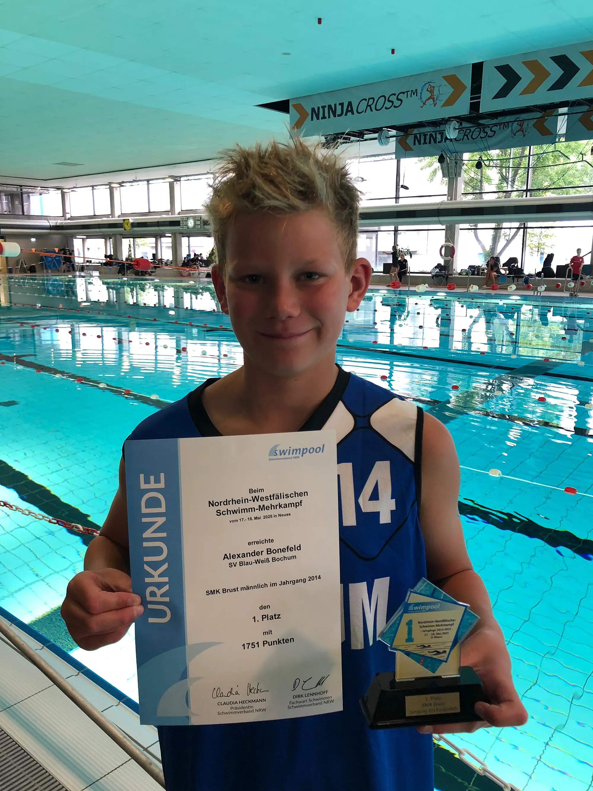Besonders hervorzuheben ist Alexander Bonefeld. Er überzeugte, wie auch im vergangenen Jahr im Brust-Mehrkampf und konnte seinen Titel verteidigen. Durch seine konstante Leistung über alle Strecken sicherte er sich den NRW-Titel. Dicht dahinter und mit einer ebenfalls souveränen Leistung konnte sich Malik Friedrichs den Vize-Titel im Brust-Mehrkampf sichern. Ebenfalls den Brust-Mehrkampf bestritt Julius Göllner. Mit einer kämpferischen Leistung konnte er sich den vierten Platz sichern und dies mit nur knappen 100 Punkten Abstand zum Podiumsplatz.