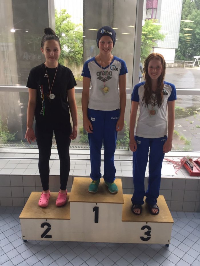rechts: Siegerehrung Jg. 2004 über 200 Meter Freistil mit Kathleen Machatik und Jule Wichtermann (1. und 3.)